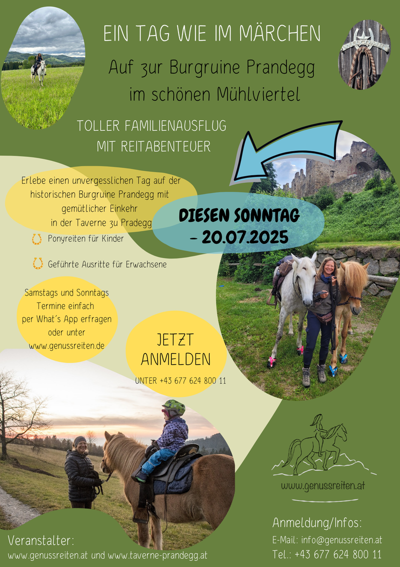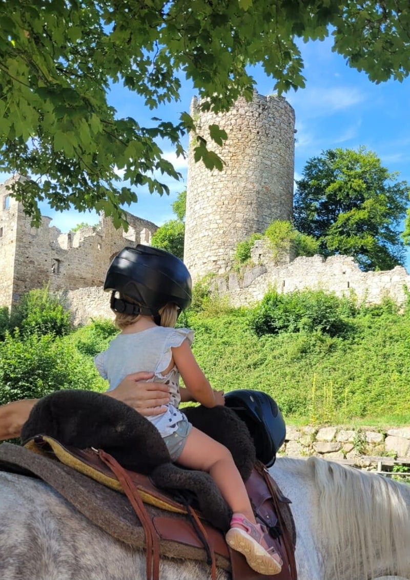 Am vergangenen Sonntag durften wir einen ganz besonderen Tag auf der Burgruine Prandegg verbringen: Bei herrlichem Sommerwetter fand unser erstes Ponyreiten für Kinder und geführte Ausritte für Erwachsene statt – und das direkt vor historischer Kulisse.